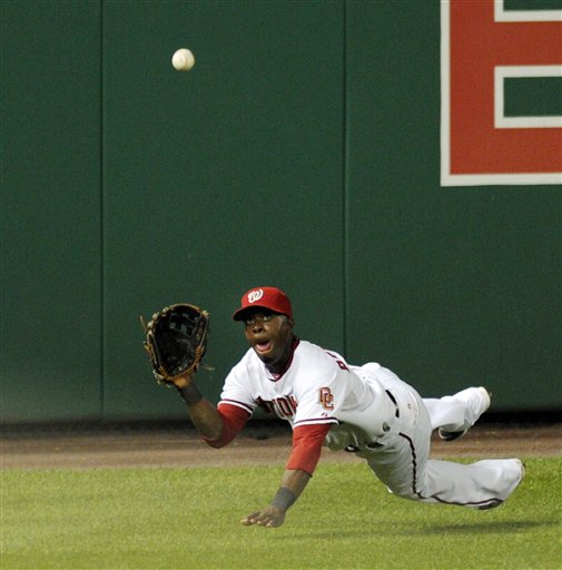 Washington Nationals left fielder Roger Bernadina catches a ball hit by Chicago Cubs Aramis Ramirez during the sixth inning of their baseball game at Nationals Park in Washington, Monday, Aug. 23, 2010. The Cubs beat the Nationals, 9-1. (AP Photo/Susan Walsh)
