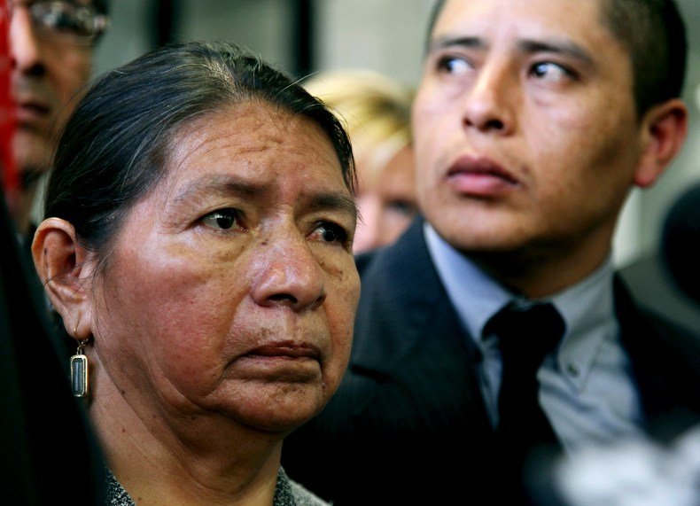 Rosario Lucero, left, listens during a news conference Monday, April 19, 2010 after the killer of her son, Marcelo Lucero, was convicted of manslaughter at the Suffolk County courthouse in Riverhead, N.Y. Jeffery Conroy, 19, a, former high school athlete who plunged a knife into the chest of the Ecuadorean immigrant during a street fight was convicted of manslaughter as a hate crime Monday but acquitted of murder. Right is Lucero's brother Joselo Lucero. (AP Photo/Craig Ruttle)