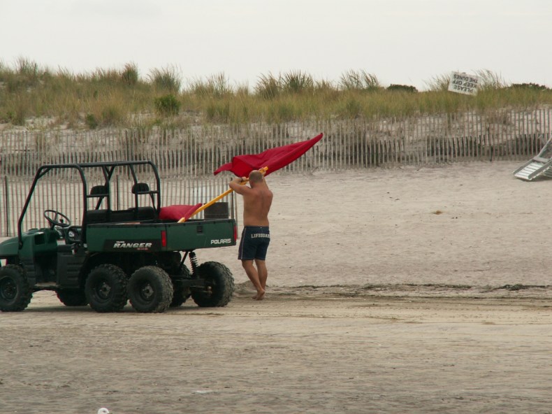 A lifeguard at Robert Moses beach puts up red flags prohibiting swimming on Friday due to rough waters caused by Hurricane Earl