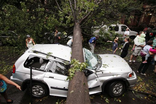 Residents in the Park Slope neighborhood in the Brooklyn borough of New York circle around a car crushed by a fallen tree, Thursday, Sept. 16, 2010. A brief but severe storm has swept through New York City, uprooting trees and damaging cars. (AP Photo/Mark Lennihan)