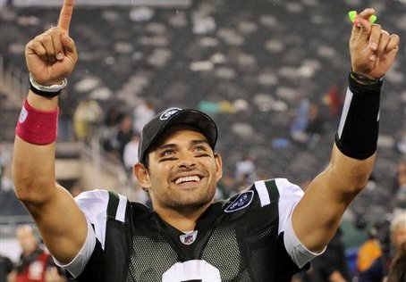 New York Jets quarterback Mark Sanchez (6) gestures to fans after the fourth quarter of an NFL football game between the Minnesota Vikings and the New York Jets Monday, Oct. 11, 2010, in East Rutherford, N.J. The Jets won the game 29-20. (AP Photo/Bill Kostroun)
