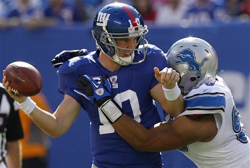New York Giants quarterback Eli Manning (10) is sacked by Detroit Lions defensive tackle Ndamukong Suh, right, during the second quarter of an NFL football game at New Meadowlands Stadium, Sunday, Oct. 17, 2010, in East Rutherford, N.J. (AP Photo/Seth Wenig)