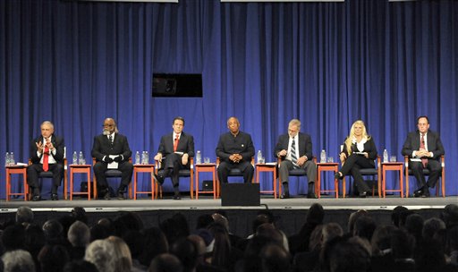 Candidates for New York State Governor participate in the 2010 Gubernatorial debate held at Hoftstra University in Hempstead, N.Y. from left, Carl Paladino, Jimmy McMillan, Andrew Cuomo, Charles Barron, Howie Hawkins, Kristin M. Davis, Warren Redlich. (AP Photo/Kathy Kmonicek