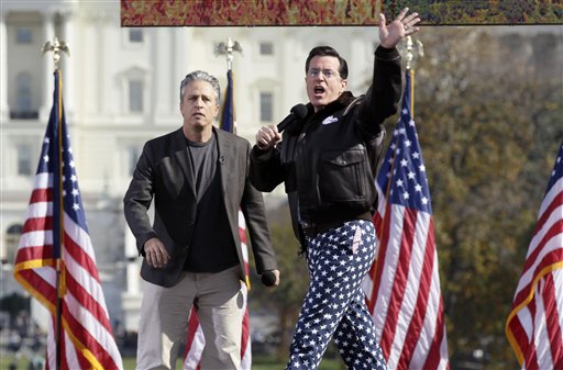 Comedians Stephen Colbert, right, and Jon Stewart perform in front of the U.S. Capitol during their Rally to Restore Sanity and/or Fear on the National Mall in Washington, Saturday, Oct. 30, 2010. (AP Photo/Carolyn Kaster)
