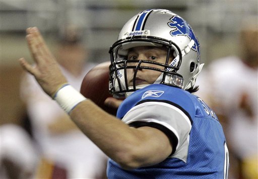 In this Oct. 31, 2010, file photo, Detroit Lions quarterback Matthew Stafford (9) looks downfield during the first quarter of an NFL football game against the Washington Redskins at Ford Field in Detroit. Stafford threw four go-ahead touchdowns in the second half last Sunday, lifting the Lions to 37-25 win over the Redskins in his first game since Week 1. (AP Photo/Carlos Osorio, File)