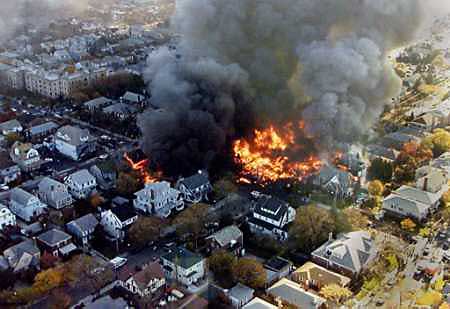 An engine from Flight 587 fell onto a gas station, just missing the gasoline pumps and an oil truck that would have exploded in the impact.