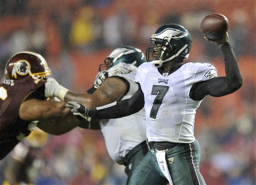 Philadelphia Eagles quarterback Michael Vick (7) throws a pass against the Washington Redskins during the second half of an NFL football game, Monday, Nov. 15, 2010, in Landover, Md. The Eagles defeated the Redskins 59-28. (AP Photo/Gail Burton)