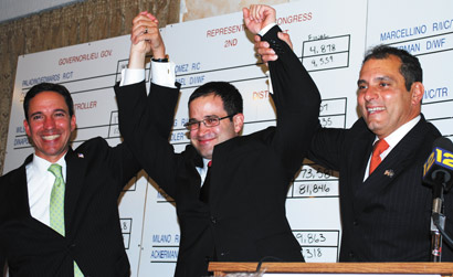 From left: Jack Martins, Edward Ra and Joseph Saladino, all Republicans, celebrate on election night.