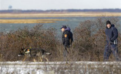 Authorities search in the brush by the side of the road at Cedar Beach, near Babylon, N.Y., Tuesday, Dec. 14, 2010. Police looking for a missing prostitute on Long Island's Fire Island have discovered three bodies and a set of skeletal remains near Oak Beach since Saturday. Investigators are considering the possibility that a serial killer may have dumped four bodies along the same quarter-mile stretch of beachside road, a police chief said. (AP Photo/Seth Wenig)