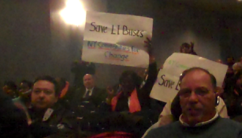 The MTA called the hearing after officials said it will have to cut up to 27 of 48 routes since Nassau County is unable to fund its $26 million annual share of the $136 million budget for the bus system, which 100,000 daily riders use to get to work, school and connect with Able Ride, a transit system for the disabled. Mangano is entertaining offers from three private bus operators as an alternative—an idea that proved unpopular with the crowd gathered at Hofstra University.