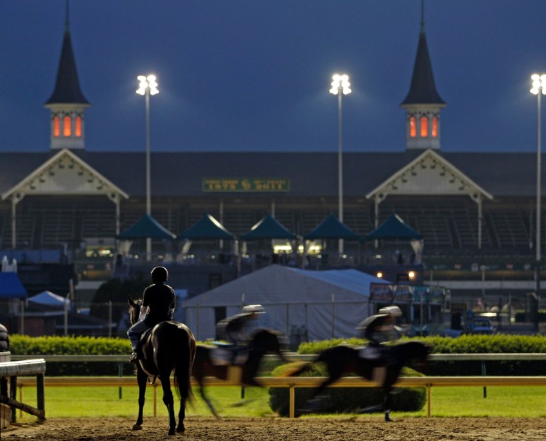 A horse makes it's way to the track for a morning workout at Churchill Downs Friday, May 6, 2011, in Louisville, Ky. (AP Photo/Charlie Riedel)