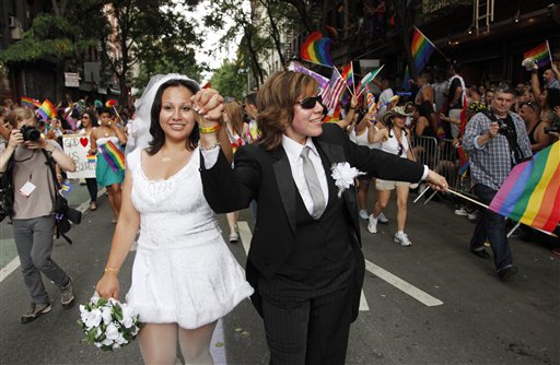 Paola Perez, left, and her partner Linda Collazo, dressed as bride and groom, march in the annual Gay Pride parade in Greenwich Village, Sunday, June 26, 2011 in New York.(AP Photo/Mark Lennihan)