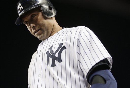New York Yankees' Derek Jeter returns to the dugout after being thrown out at first base to end a baseball game against the Tampa Bay Rays on Thursday, July 7, 2011, at Yankee Stadium in New York. The Rays won 5-1. (AP Photo/Frank Franklin II)
