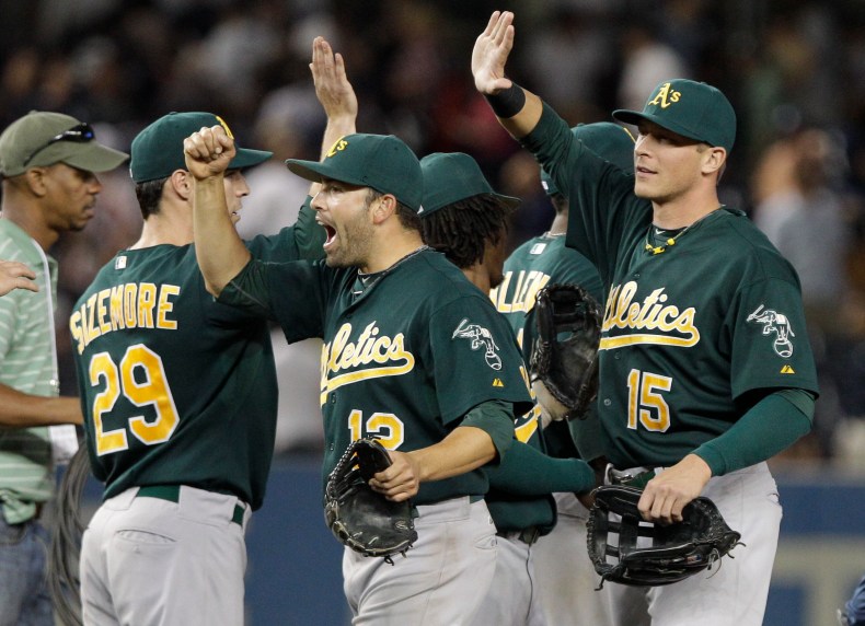 Oakland Athletics' Jerry Blevins (13) celebrates with teammates, including Scott Sizemore (29) and Ryan Sweeney (15), after of a baseball game against the New York Yankees Tuesday, Aug. 23, 2011, at Yankee Stadium in New York. The Athletics won 6-5. (AP Photo/Frank Franklin II)