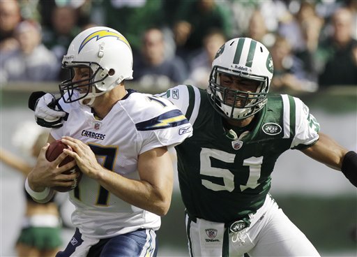 FILE - In this Oct. 23, 2011 file photo, New York Jets' Aaron Maybin (51) (AP Photo/Kathy Willens, File)