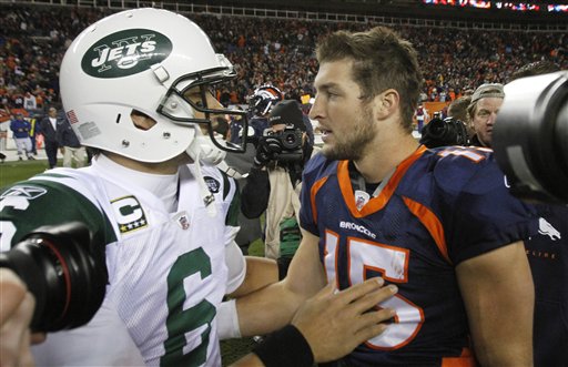 New York Jets quarterback Mark Sanchez (6) and Denver Broncos quarterback Tim Tebow (AP Photo/Barry Gutierrez)