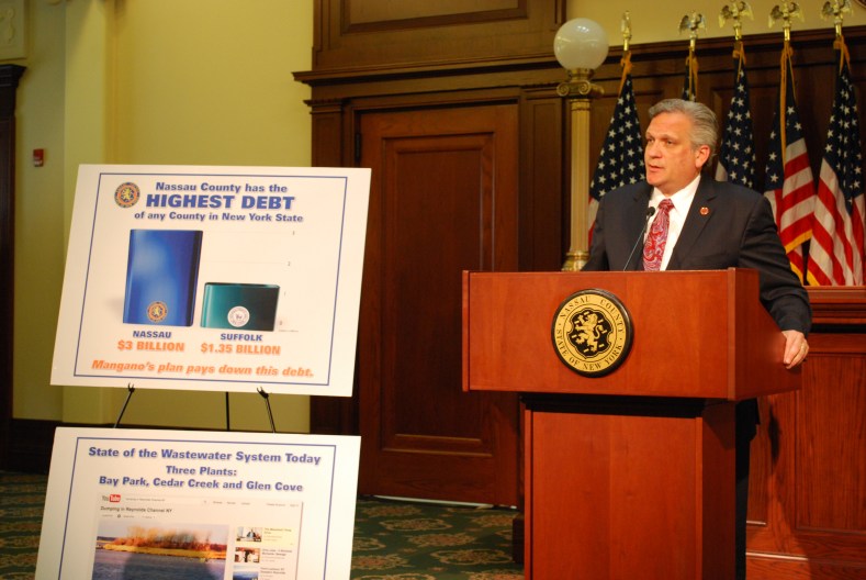 Mangano touted the arrangement as a possible solution to addressing two of Nassau’s “biggest problems”: its $3 billion debt, which he said is the highest in the state, and its troubled sewer infrastructure, which he said a 2009 report by state fiscal watchdog Nassau Interim Finance Authority (NIFA) warned was headed toward bankruptcy by 2014.