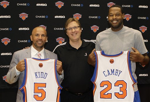 Jason Kidd, left, and Marcus Camby, right, pose with their new jerseys and New York Knicks general manager Glen Grunwald after the team announced their newest signees at the team's NBA basketball training facility in Tarrytown, N.Y., Thursday, July 12, 2012. (AP Photo/Kathy Willens)