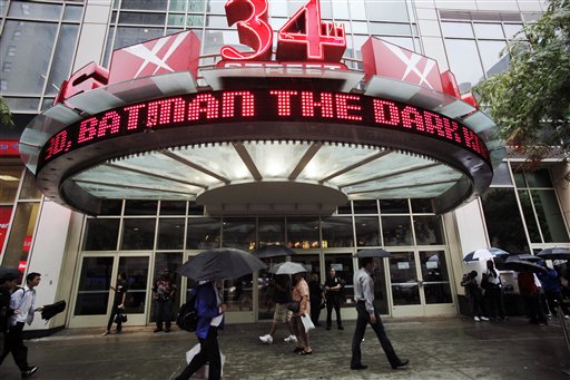 A New York City police officer, center rear, stands in front of a midtown Manhattan movie theater as people line up, right, for a screening of "The Dark Knight Rises," Friday, July 20, 2012 in New York. (AP Photo/Mark Lennihan)