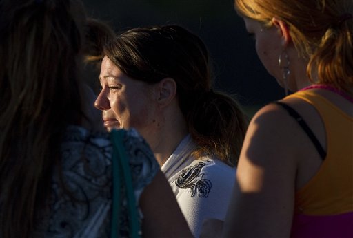 A woman cries outside Gateway High School where witness were brought for questioning after a gunman opened fire at a midnight premiere of The Dark Knight Rises Batman movie Friday, July 20, 2012 in Aurora, Colo. A gunman wearing a gas mask set off an unknown gas and fired into the crowded movie theater killing 12 people and injuring at least 50 others, authorities said.(AP Photo/Barry Gutierrez)