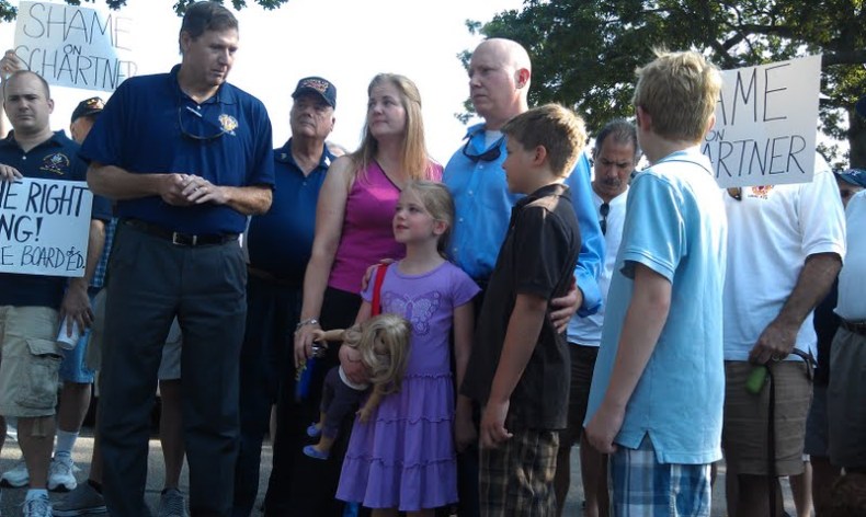 Before the 9:30 a.m. hearing, Reddan, a New York Fire Department captain, spoke to a group of fellow firefighters who rallied outside the Sayille administrative office in support of the family, holding signs admonishing superintendent Dr. Walter Schartner.