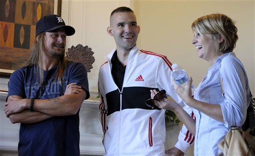 In this Saturday, Aug. 18, 2012 photo, Dana Dumar, right, tries to find the words during media interviews as she stands with her husband, Davin Dumar, center, and Kid Rock, in the model house similar to the one that will be built for the couple in Macomb Township, Mich. Kid Rock joined Dan Wallrath, founder of Operation Finally Home, and representatives of the Pulte Group to present Dumar , a veteran of Afghanistan who lost his leg and severely injured his arm in combat, and his wife Dana, with a free new home. (AP Photo/Detroit News, Todd McInturf)