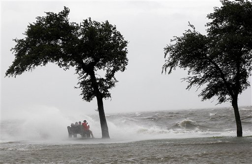People sit on a bench along the seawall in the storm surge from Isaac, on Lakeshore Drive along Lake Pontchartrain, as the storm approaches landfall, in New Orleans, Tuesday, Aug. 28, 2012. (AP Photo/Gerald Herbert)