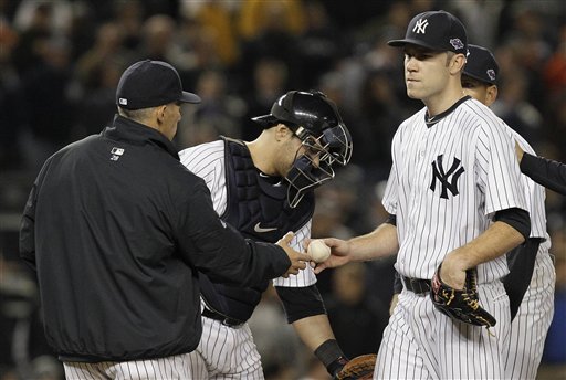 New York Yankees manager Joe Girardi takes relief pitcher David Phelps out of the game during the 13th inning of Game 4 of the American League division baseball series against the Baltimore Orioles on Thursday, Oct. 11, 2012, in New York. The Orioles won 2-1. (AP Photo/Kathy Willens)