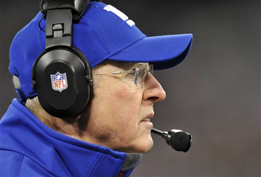 New York Giants head coach Tom Coughlin looks on from the sideline in the first half of an NFL football game against the Baltimore Ravens in Baltimore, Sunday, Dec. 23, 2012. (AP Photo/Gail Burton)